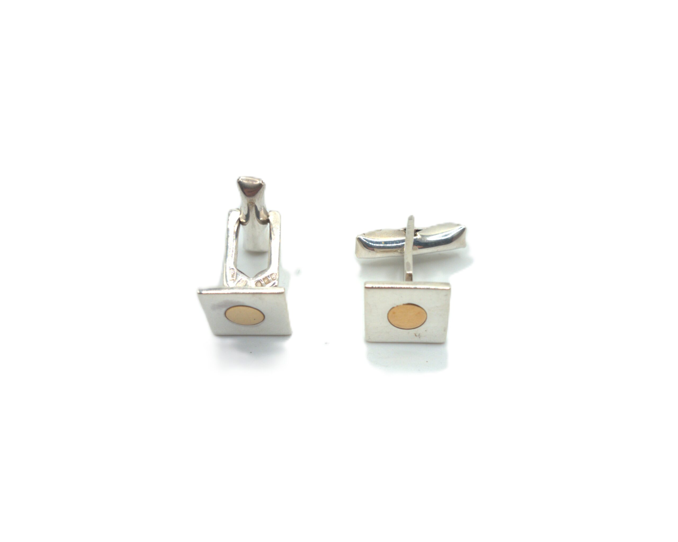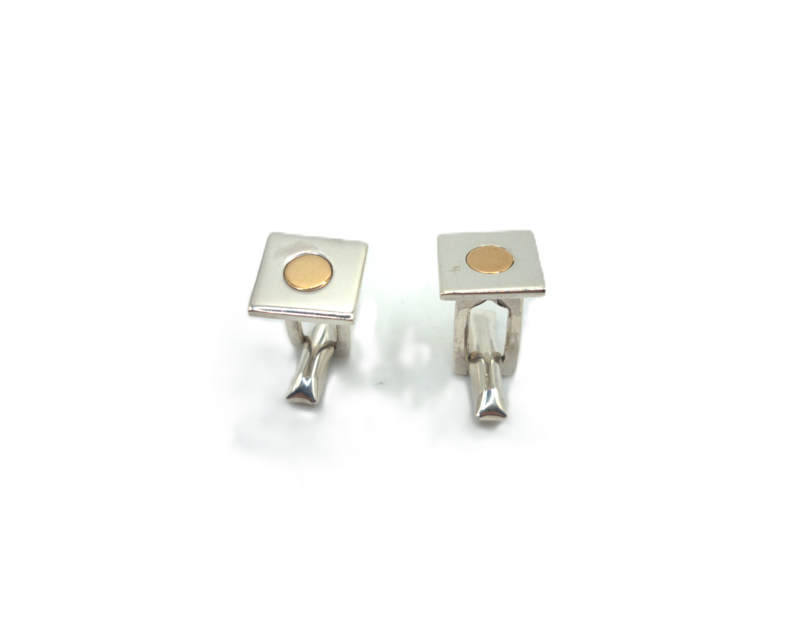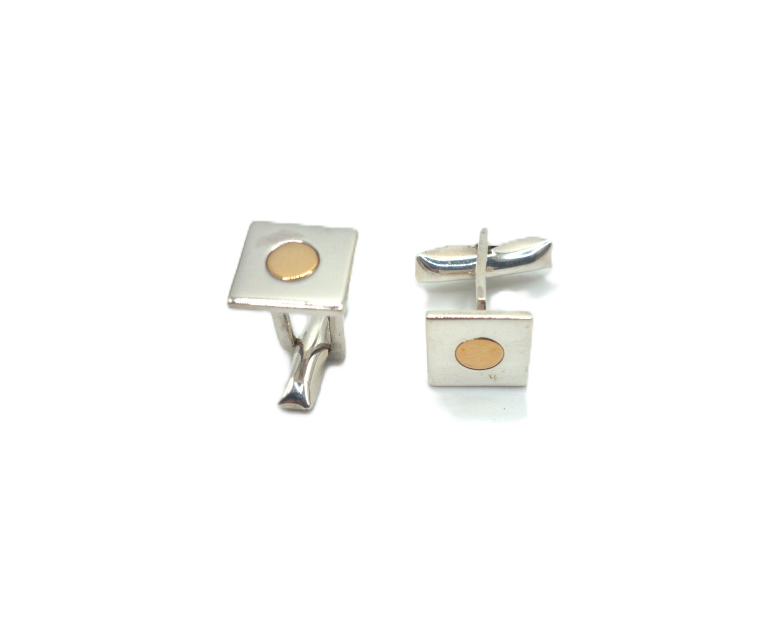 Clásica pareja de gemelos realizados en plata de primera ley 925. Estos gemelos tienen un diseño con un motivo en forma cuadrado con un punto dorado en el centro