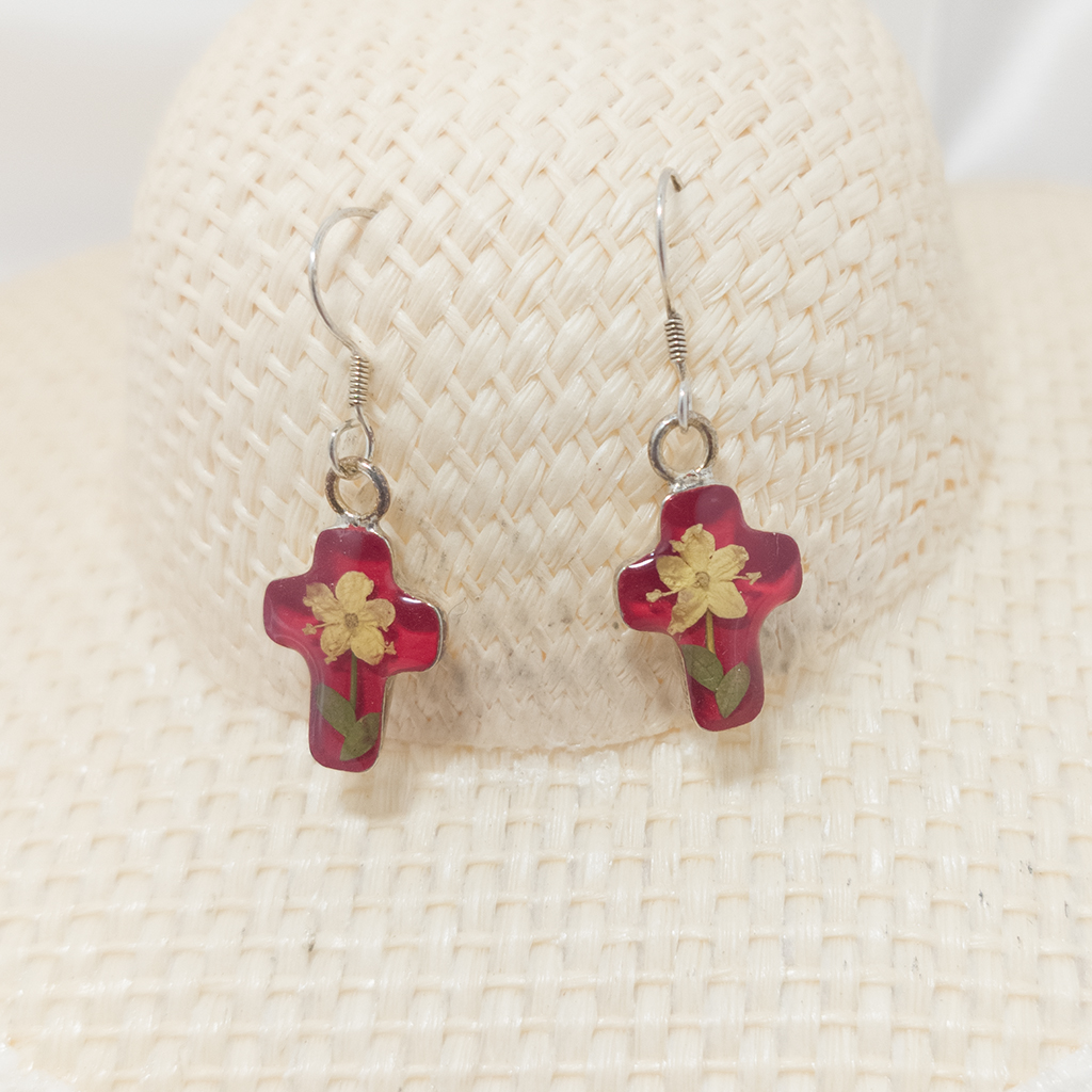 Pendiente de Cruz con flor natural encapsuladas en Resina. Base del pendiente en plata 925